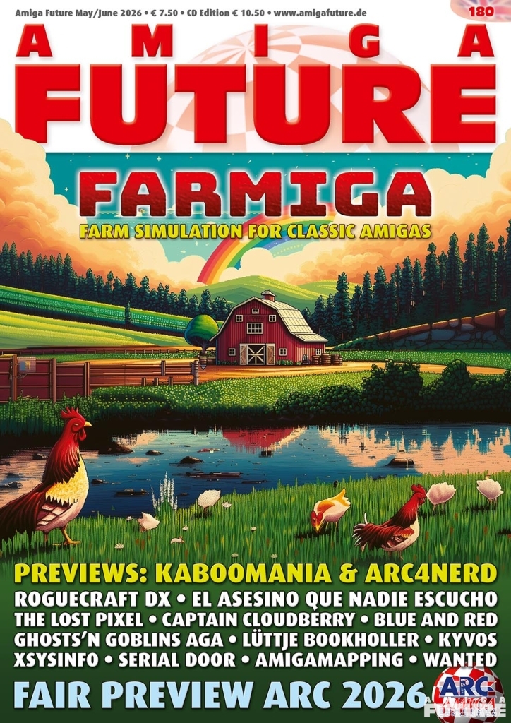 Μέχρι τις 25 Απριλίου θα κυκλοφορήσει το νέο τεύχος του AmigaFuture #180 Μαϊου - Ιουνίου 2026. Το AmigaFuture είναι ένα από τα λίγα έντυπα περιοδικά για τον χώρο της Amiga, το οποίο καλύπτει όλες τις εκδόσεις των λειτουργικών AmigaOS 4.x, AmigaOS 3.x, MorphOS και Aros. Κυκλοφορεί κάθε 2 μήνες σε 2 γλώσσες, στα Αγγλικά και τα Γερμανικά. Για να το αποκτήσετε μπορείτε να το αγοράσετε από τα online καταστήματα APC & TCP και AmigaStore. Σας προτείνουμε να γίνετε συνδρομητές ώστε να το βρίσκετε άμεσα στο ταχυδρομικό σας κουτί.